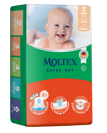 “Moltex Extra Dry” 2 MINI ir īpaši izstrādāts mazuļiem no 4 līdz 8 kg.