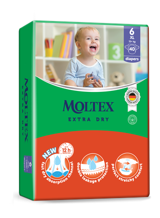 “Moltex Extra Dry” 6 XL ir īpaši izstrādāts mazuļiem 15+ kg.