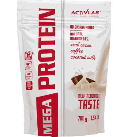 Activlab Mega protein 700g. Olbaltumvielu pulveris kokteiļu pagatavošanai, ar saldinātājiem. Satur kofeīnu (40 mg / 33 g (kafijas garšā) un 25 mg / 33 g (kafijas un tiramisu garšā)). Nav ieteicams bērniem un grūtniecēm.