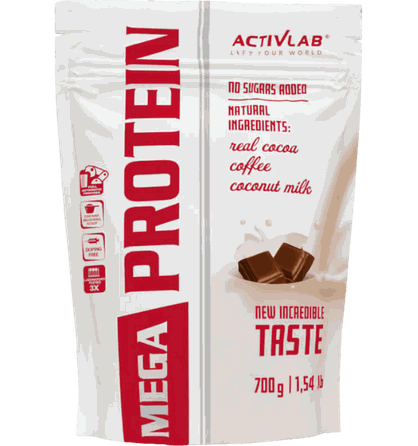 Activlab Mega protein 700g. Olbaltumvielu pulveris kokteiļu pagatavošanai, ar saldinātājiem. Satur kofeīnu (40 mg / 33 g (kafijas garšā) un 25 mg / 33 g (kafijas un tiramisu garšā)). Nav ieteicams bērniem un grūtniecēm.