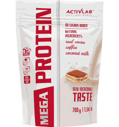 Activlab Mega protein 700g. Olbaltumvielu pulveris kokteiļu pagatavošanai, ar saldinātājiem. Satur kofeīnu (40 mg / 33 g (kafijas garšā) un 25 mg / 33 g (kafijas un tiramisu garšā)). Nav ieteicams bērniem un grūtniecēm.
