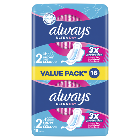 Izbaudiet trīskāršu aizsardzību, ko piedāvā ALWAYS Ultra Day Super (2. izmērs) higiēniskās paketes ar spārniņiem. Always paketes ar absorbējošo un maigo virskārtu uzsūc mitrumu dažās sekundēs, pateicoties InstantDry tehnoloģijai un LeakGuard un OdourLock tehnoloģijām, novēršot noplūdes un nepatīkamos aromātus. Pakešu unikālie ComfortLock spārniņi ir paredzēti, lai labāk piegulētu jebkurai apakšveļai. Īpašai aizsardzībai naktī izmēģiniet Always Night izmērus. Always paketes ir dermatoloģiski apstiprinājusi Ādas veselības alianse (Skin Health Alliance).