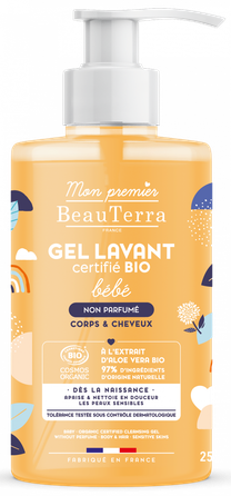 Beauterra BIO mazgāšanās gels bērniem bez aromāta – BIO sertificēts dabisks mazgāšanās līdzeklis, kas piemērots lietošanai ikdienā jutīgai un reaģējošai mazuļu ādai. 97% dabas sastāvdaļu, no tām 10% BIO izcelsmes.