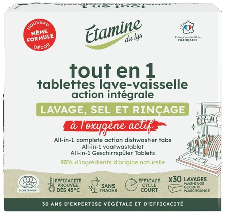 Etamine du Lys apvieno trauku mazgāšanas, atkaļķošanas (sāls) un skalošanas funkcijas vienā tabletē! Trauku mazgājamās mašīnas kopšanai nav nepieciešami papildu līdzekļi. Viena mazgāšana - viena tablete. Bez smaržvielām.