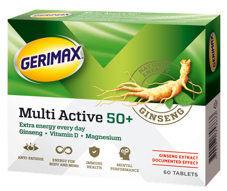 Gerimax MULTI ACTIVE 50+ pilnīga vitamīnu, minerālvielu kombinācija. Sastāvs piemērots vīriešiem un sievietēm virs 50 gadu vecuma, veicinot labas veselības uzturēšanu. Vitamīni A, B6, B12, C, D, folskābe, cinks, dzelzs, varš un selēns veicina normālu imūnsistēmas darbību. Pantotēnskābe palīdz samazināt nogurumu un nespēku, palīdz uzturēt garīgās darba spējas. Vitamīni E, C, B2, cinks, selēns, mangāns un varš palīdz aizsargāt šūnas no oksidatīvā stresa. Žeņšeņs palīdz saglabāt garīgo un fizisko aktivitāti, atmiņu, mazina nogurumu. Žeņšeņs nodrošina enerģiju ķermenim un prātam.