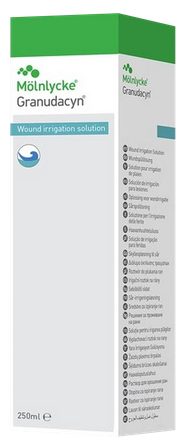 Granudacyn® ir šķīdums būrču mazgāšanai akūtu, hronisku un netīru brūču tīrīšanai un mitrināšanai, kā arī pirmās un otrās pakāpes apdegumiem. To var izmantot arī radiācijas čūlu, fistulu un abscesu, dobumu iekaisumu, piemēram, ausu, deguna un rīkles, kritiski kolonizētu brūču un mīksto audu traumu gadījumos. To var tālāk izmantot, lai samitrinātu brūces pārsēju un mitrinātu piekaltušu brūču pārsēju.
