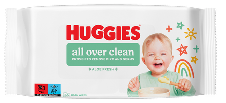 Huggies All Over Clean viegli notīra un atsvaidzina. Hipoalerģiskas salvetes ir piemērotas mazuļa maigajai ādai, jo tās nesatur alkoholu, fenoksietanolu un parabēnus.