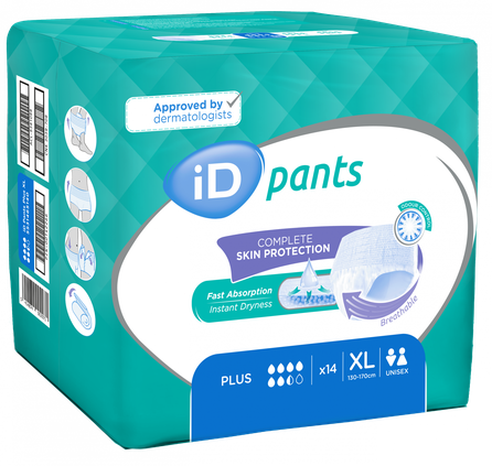 iD Pants PLUS XL ir Uzsūcošas bikses urīna un fēču vidējai un smagai nesaturēšanai, ar anatomiski pielāgotu formu kustīgiem pacientiem. Elastīgās nošuves izstrādājuma jostas daļā šķērso uzsūcošo daļu priekšā un aizmugurē kas nodrošina labāku piekļaušanos ķermenim un pasargā no noplūdēm. Uzsūcošā daļa ar īpaši ātru šķidruma izolāciju no ādas tehnoloģiju ,papildus iestrādāts nepiesaistīts slānis absorbējošajā daļā, absorbē mitrumu daudz ātrāk. EDS slānis, kas atrodas zem augšējā nepiesaistītā slāņa, ļauj labāk un efektīvāk sadalīt un noturēt mitrumu absorbējošās daļas iekšpusē, tādējādi palielinot sausuma sajūtu un uzlabojot komfortu.