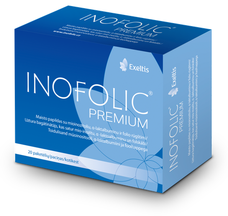 INOFOLIC® PREMIUM uztura bagātinātājs, kas satur mio-inozītu, α -laktoalbumīnu un folskābi, nesatur glutēnu.