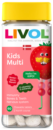 LIVOL Kids Multi ar zemeņu garšu – augstas kvalitātes 16 vitamīnu un minerālvielu komplekss, ko radījuši Dānijas eksperti saskaņā ar pēdējām Ziemeļvalstu uztura rekomendācijām (vairāk informācijas www. livol.lv). Nesatur glutēnu. Bez cukura. 11 vitamīni un 5 minerālvielas.