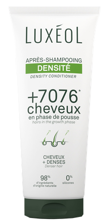 Luxéol Hair Density Conditioner kondicionieris klīniski pierādīti palielina matu blīvumu par 7076 matiem augšanas fāzē*. Tā formula, kas satur 98 % dabīgas izcelsmes sastāvdaļu un ir bagātināta ar aktīvajām vielām un biotīnu, stiprina mata stiebru un veicina tā augšanu. Rezultāts: redzami biezāki, spīdīgāki un stiprāki mati. * Klīnisks pētījums ar 32 personām; esošo matu skaita pieaugums uz cm² pēc 12 nedēļu lietošanas 3 reizes nedēļā.