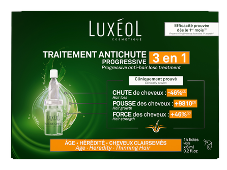 Luxéol Progressive Hair Loss 3 in 1 ir kosmētisks līdzeklis ar klīniski pierādītu iedarbību uz matu augšanu, izturību un blīvumu – tas palīdz samazināt matu izkrišanu un palielina matu blīvumu. * Klīnisks pētījums ar 27 vīriešiem un 28 sievietēm ar progresējošu matu izkrišanu; 3 mēnešu lietošana, 3 ampulas nedēļā.