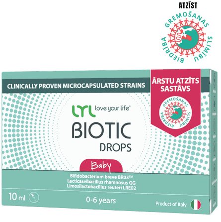 LYLBIOTIC Drops apvieno zīdaiņiem un bērniem īpaši vērtīgos Lacticaseibacillus rhamnosus GG, Limosilactobacillus reuteri LRE02 un Bifidobacterium breve BR03™️ baktēriju celmus.