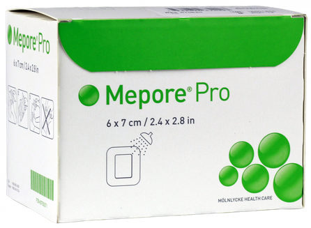 Ūdensizturīgs pašlīpošs absorbējošs pārsējs. Mepore Pro ir viskozes materiāla absorbējošs pārsējs brūcē. Kārta, kas nonāk saskarē ar brūci, ir nepielīpoša brūcei. Gaisu caurlaidīgā plēve nodrošina ūdensizturīgu barjeru, kas pasargā no mitruma un bakteriju iekļūšanas brūcē. Mepore Pro labi pieguļ ķermeņa kontūrām. Līpošā kārta ir akrila līme veidota uz ūdens bāzes. Tā ir ādai saudzīga un nesatur organiskus šķīdinātājus. Līmējošā josla ir pārklāta ar divām aizsargplēvītēm, kas nodrošina aseptisku pārsēja uzklāšanu. Mepore Pro paredzēts viegli vai mēreni eksudējošu brūču, piemēram, ķirurģisko brūču, grieztu brūču un nobrāzumu, pārsiešanai.