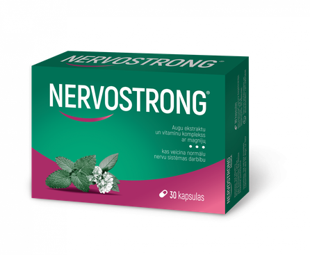 Nervostrong® ir dabisks līdzeklis, kas nomierina, relaksē nervu sistēmu, mazina spriedzi, aizkaitināmību, nervozitāti un citas stresa sekas, uzlabo garastāvokli un miegu. Lietojot regulāri, Nervostrong® stiprina nervu sistēmu un uzlabo cilvēka emocionālo stāvokli, pieaug nervu sistēmas izturība pret stresiem un nervu pārslodzēm. Nervostrong® sastāvā ietilpst magnijs ar B grupas vitamīniem (B2 jeb riboflavīns, B3 jeb niacīns, B6, B12), kas veicina normālu nervu sistēmas darbību un palīdz samazināt nogurumu un nespēku, folskābe (folāti), kas veicina normālas psiholoģiskās funkcijas, neaizvietojamā aminoskābe L-triptofāns un ārstniecības augu ekstrakti (baldriāna, melisas u.c.), kam piemīt nomierinoša un relaksējoša iedarbība.