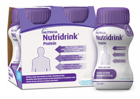 Īpašiem medicīniskiem nolūkiem paredzēta pārtika. Uztura režīms cilvēkiem nepietiekama uztura uzņemšanas gadījumā un, kuri ir pakļauti nepietiekama uztura uzņemšanas riskam kādu saslimšanu gadījumā, īpaši pacientiem ar paaugstinātu nepieciešamību pēc olbaltumvielām, piemēram, audzēju gadījumā. Nutridrink Protein ir produkts ikdienas uztura papildināšanai ar augstu olbaltumvielu saturu un ar augstu enerģētisko vērtību. Nesatur lipekli.