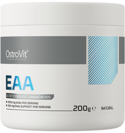<div>OstroVit®TECHNOLOGY OF NUTRITION EAA</div><div><br></div><div>Ar dabīgo garšu</div><div><br></div><div>Satur 10 neaizvietojamās aminoskābes</div><div><br></div><div>Viena porcija satur 6700 mg neaizvietojamās aminoskābes un 930 mg neaizvietojamo aminoskābju atbalsta kompleksu.</div><div><br></div><div>Tikai aktīvās sastāvdaļas</div><div><br></div><div>Bez pievienotām krāsvielām, aromatizētājiem vai apjoma palielinātājiem.Uztura bagātinātājs</div><div><br></div><div>Neto masa:200 g</div><div><br></div><div><span style="font-weight: bold;">Brīdinājumi</span>: Nepārsniedziet ieteicamo dienas devu. Neizmantot uztura bagātinātāju pilnvērtīga un sabalansēta uztura aizvietošanai. Ieteicams sabalansēts uzturs un veselīgs dzīvesveids. Nelietot, ja Jums ir alerģija pret kādu no sastāvdaļām. Bērni, grūtnieces un sievietes, kas baro bērnu ar krūti, nedrīkst lietot šo produktu. Uzglabāt bērniem nepieejamā vietā.</div><div><br></div><div>Uzglabājiet šo iepakojumu cieši noslēgtu, sausā vietā, 15-25 °C grādu temperatūrā. Sargāt no bērniem.</div><div><br></div><div>Sastāvdaļas: Uz 1 porciju 10 g (1,5 kausiņiem)</div><div><br></div><div>L-leicīns 3000 mg</div><div><br></div><div>L-izoleicīns 1500 mg</div><div><br></div><div>L-valīns 1500 mg</div><div><br></div><div>L-lizīna hidrohlorīds 1350 mg</div><div><br></div><div>L-treonīns 700 mg</div><div><br></div><div>L-fenilalanīns 700 mg</div><div><br></div><div>L-metionīns 450 mg</div><div><br></div><div>L- arginīns 400 mg</div><div><br></div><div>L-histidīns 300 mg</div><div><br></div><div>L-triptofāns 100 mg</div><div><br></div><div>Sastāvdaļas: Uz 2 porcijām 20 g (3 kausiņiem)</div><div><br></div><div>L-leicīns 6000 mg</div><div><br></div><div>L-izoleicīns 3000 mg</div><div><br></div><div>L-valīns 3000 mg</div><div><br></div><div>L-lizīna hidrohlorīds 2700 mg</div><div><br></div><div>L-treonīns 1400 mg</div><div><br></div><div>L-fenilalanīns 1400 mg</div><div><br></div><div>L-metionīns 900 mg</div><div><br></div><div>L- arginīns 800 mg</div><div><br></div><div>L-histidīns 600 mg</div><div><br></div><div>L-triptofāns 200 mg</div><div><br></div>