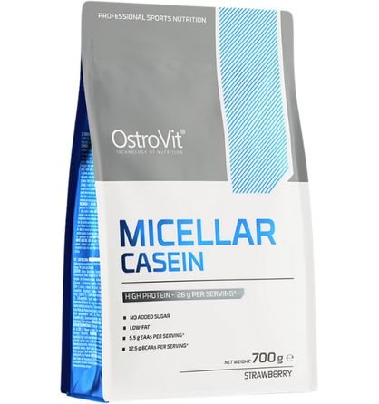 OstroVit Micellar Casein 700 g. Pārtikas piedeva pulvera veidā ar saldinātājiem. Satur dabā sastopamus cukurus.