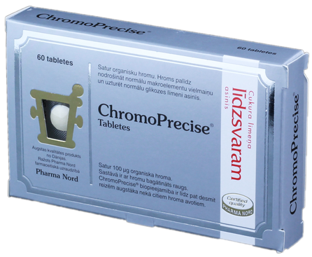 ChromoPrecise ir hroma produkts, kas satur 100 mg šī dzīvībai svarīgā mikroelementa katrā tabletē. Hroms ir svarīga minerālviela, kas palīdz nodrošināt normālu makroelementu (ogļhidrātu, tauku un olbaltumvielu) vielmaiņu. Turklāt hroms uztur bioloģiskos procesus, kas nepieciešami normāla cukura līmeņa uzturēšanai asinīs. Neorganiski saistītajam hromam parasti ir zema bioloģiskā pieejamība. Hroma preparāta efektivitāti nosaka tas, cik labi šī uzturviela uzsūcas organismā. Produkts tiek ražots, izmantojot patentēto organiskā hroma avotu ChromoPrecise®. Tas ir īpašs hroma raugs, kas ir speciāli izstrādāts tā, lai nodrošinātu optimālu bioloģisko pieejamību.