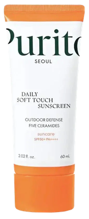 Purito Daily Soft Touch Sunscreen ir ceļojuma izmēra SPF 50+ PA++++ saules aizsargkrēms, kas nodrošina plaša spektra UV aizsardzību ar vieglu, neredzamu pārklājumu. Bagātināts ar pieciem keramīdiem, Centella un pantenolu, tas mitrina, nomierina jutīgu ādu un stiprina ādas barjeru komfortablai ikdienas aizsardzībai pret sauli.