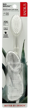Zobu birste „Radius“ BIG BRUSH ar maināmu galviņu. Iegādājoties rezerves galviņas, tiek ietaupīti aptuveni 30% no birstes vērtības un aptuveni 70% birstes nenonāk atkritumu plūsmā. Visas birstē izmantotās gumijas ir dabiskas izcelsmes (bez naftas produktiem). Četras reizes mīkstāki, noapaļoti sariņi nodrošina izcilu aplikuma noņemšanu un plašu smaganu masāžu. Uz pusi mazāk plastmasas birstes galviņā un plāns, elastīgs kakliņš ļauj ērti sasniegt grūti aizsniedzamas vietas. BIG BRUSH ir maināma galviņa.
