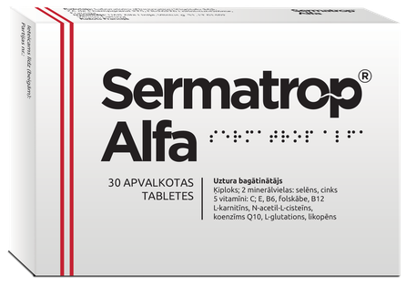 Sermatrop Alfa® – mikroelementu, vitamīnu, antioksidantu, augu ekstraktu un aminoskābju komplekss vīriešiem, kuri vēlas uzturēt normālu fertilitāti un reproduktīvo spēju.
