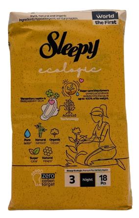 Sleepy Ecologic higiēniskās paketes tiek izgatavotas no 100% dabīgas kokvilnas un bambusa šķiedrām. Ražošanas procesā tiek izmantotas tikai dabīgas un organiskas sastāvdaļas. Netiek balinātas, tādēļ ir maigi bēšas. Katra pakete tiek iesaiņota atsevišķi, bioloģiski noārdāmā iepakojumā. Anatomiska forma, kvalitatīva līmes kārta un papildus iestrādātās rieviņas nodrošina pret noplūdēm pat naktī.
