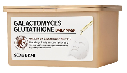 Some By Mi Galactomyces Glutathione Daily Mask izgaismojošas sejas maskas ar glutationu, C vitamīnu un galaktomyces raugu. Sejas maskas izgaismo, padara ādu gaišāku, atdzīvina nogurušu un blāvu ādu, piešķirot tai gludu tekstūru un starojošu izskatu. Sastāvā ir arī rīsu, brokoļu ekstraktu un balto ziedu ekstraktu komplekss, kas efektīvi papildina masku izgaismojošo efektu. 8 dažādu veidu hialuronskābes nodrošina mitrumu visiem ādas slāņiem.