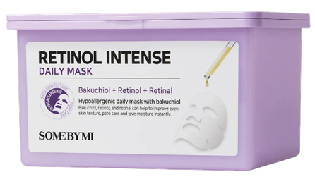 Some By Mi Retinol Intense Daily Mask – sejas maskas ar retinolu, 30 gab. Retinols + bakuhiols izlīdzina ādas tekstūru, nostiprina, stimulē kolagēna ražošanu.