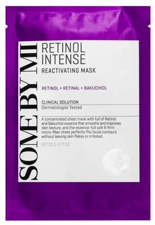 Some By Mi - Retinol Intense Reactivating Mask - sejas maska ar retinolu, kam piemīt izlīdzinoša, nostiprinoša iedarbība un kas padara ādu gaišāku. Turklāt produkts satur bakuhiolu, kas piešķir ādai elastību, un mitrinošu hialuronskābi.