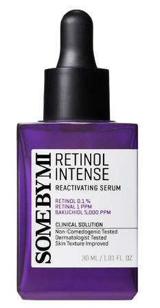 SOME BY MI Retinol Intense Reactivating Serum ir retinola sejas serums, kas bagāts ar efektīvām aktīvajām sastāvdaļām. Tas satur 0,1% retinola, kas padara ādu gaišāku, bakuchiolu, kas padara ādu elastīgāku un tvirtāku, uzlabo ādas toni. Sastāvs ir bagātināts arī ar tādām sastāvdaļām kā keramīdi, kas baro ādu un aizsargā to no sausuma. Turklāt sastāvā esošais Āzijas centellas ekstrakts nomierina ādu.