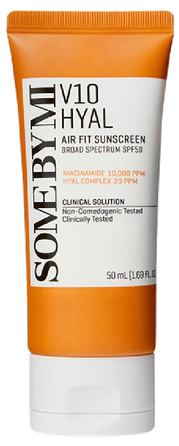 SOME BY MI V10 Hyal Airfit saules aizsargkrēms piedāvā plaša spektra SPF 50 aizsardzību, neatstājot baltu kārtu, padarot to par lielisku izvēli ikdienas aizsardzībai pret sauli.