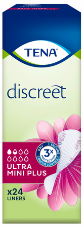 TENA Discreet Ultra Mini Plus ir īpaši gari urīnpūšļa vājumam paredzēti ieliktnīši, kas sievietēm ar nelielu urīnpūšļa vājumu piedāvā nemanāmu aizsardzību dažādu aktivitāšu laikā vai klepojot un šķaudot. Izgatavoti, lai nodrošinātu daudz lielāku uzsūktspēju nekā parastie biksīšu ieliktnīši, izmantojot microPROTEX™ tehnoloģiju, kas paredzēta, lai nekavējoties absorbētu nepatīkamo aromātu un mitrumu. Nemanāma aizsardzība ir tikpat svarīga kā drošība.