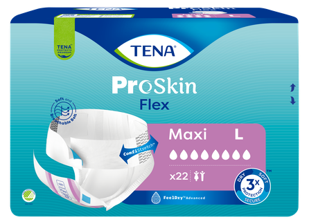 TENA ProSkin Flex Maxi ir elastīgas jostbikses pret urīna nesaturēšanu, kas izstrādātas, lai tās būtu vieglāk un ergonomiskāk nomaināmas. Tās ir piemērotas cilvēkiem, kas pārvietojas, ir mazkustīgi vai guloši. TENA ProSkin Flex ar FeelDry Advanced™ slāni nodrošina izcilu aizsardzību, ātri aizvadot šķidrumu prom no virskārtas un saglabājot ādu sausu. Īpaši ātri uzsūcošais slānis momentāni uzsūc pat lielu daudzumu urīna, efektvīvi novada to produkta dzīļakajos slāņos, nodrošinot sausuma sajūtu. Pilnīgi elpojošs ConfioAir™ ārējais slānis ļauj ādai brīvi elpot. Visas šīs priekšrocības saudzē ādu. ComfiStretch josta nodrošina pielāgošanas iespējas vēl lielākam komfortam un labākai aizsardzībai. Lai jostbikses būtu vieglāk izmantojamas, jostai ir viegli fiksējami klipši, kurus var droši piefiksēt, pielāgojot izstrādājumu auguma aprisēm.