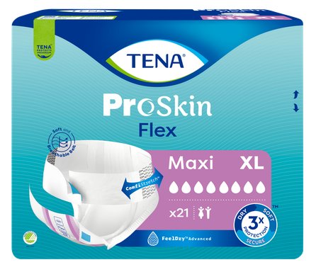TENA ProSkin Flex Maxi ir elastīgas jostbikses pret urīna nesaturēšanu, kas izstrādātas, lai tās būtu vieglāk un ergonomiskāk nomaināmas. Tās ir piemērotas cilvēkiem, kas pārvietojas, ir mazkustīgi vai guloši. TENA ProSkin Flex ar FeelDry Advanced™ slāni nodrošina izcilu aizsardzību, ātri aizvadot šķidrumu prom no virskārtas un saglabājot ādu sausu. Īpaši ātri uzsūcošais slānis momentāni uzsūc pat lielu daudzumu urīna, efektvīvi novada to produkta dzīļakajos slāņos, nodrošinot sausuma sajūtu. Pilnīgi elpojošs ConfioAir™ ārējais slānis ļauj ādai brīvi elpot. Visas šīs priekšrocības saudzē ādu. ComfiStretch josta nodrošina pielāgošanas iespējas vēl lielākam komfortam un labākai aizsardzībai. Lai jostbikses būtu vieglāk izmantojamas, jostai ir viegli fiksējami klipši, kurus var droši piefiksēt, pielāgojot izstrādājumu auguma aprisēm.