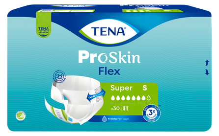 TENA ProSkin Flex Super S (paredzēts lietotājam ar gurnu apkārtmēru no 61 cm līdz 87 cm) ir elastīgas jostbikses urīna nesaturēšanas gadījumiem, kas izstrādātas, lai tās būtu vieglāk un ergonomiskāk nomaināmas. Tās ir piemērotas cilvēkiem, kas pārvietojas, ir mazkustīgi vai guloši. TENA ProSkin Flex ar FeelDry Advanced™ slāni nodrošina izcilu aizsardzību, ātri aizvadot šķidrumu prom no virskārtas un saglabājot ādu sausu. Īpaši ātri uzsūcošais slānis momentāni uzsūc pat lielu daudzumu urīna, efektvīvi novada to produkta dzīļakajos slāņos, nodrošinot sausuma sajūtu. Pilnīgi elpojošs ConfioAir™ ārējais slānis ļauj ādai brīvi elpot. Visas šīs priekšrocības saudzē ādu. ComfiStretch™ josta nodrošina pielāgošanas iespējas vēl lielākam komfortam un labākai aizsardzībai. Lai jostbikses būtu vieglāk izmantojamas, jostai ir viegli fiksējami klipši, kurus var droši piefiksēt, pielāgojot izstrādājumu auguma aprisēm.