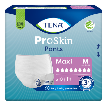 TENA Pants ProSkin Maxi M (paredzētas lietotājam ar gurnu apkārtmēru no 80 līdz 110 cm) ir mīkstas un ērtas vīriešiem un sievietēm piemērotas biksītes urīna nesaturēšanas gadījumiem, lietojamas dienā un naktī. Atšķirībā no parastajām pieaugušo autiņbiksītēm TENA ProSkin Pants raksturo uzlabotas mitrumu samazinošas tehnoloģijas, kas nodrošina augstu uzsūktspēju, aizsardzību pret noplūdēm un smakām. Pilnīgai drošībai FeelDry Advanced™ ātri aizvada šķidrumu no virsmas, savukārt ātri uzsūcošā vidusdaļa uzreiz ieslēdz pat lielus urīna daudzumus, tādējādi mitrums nepaliek uz ādas un tas palīdz uzturēt ādu veselu. Šīs vienreizlietojamās biksītes ir izgatavotas no audumam līdzīgiem gaiscaurlaidīgiem materiāliem, kam ir izcila uzsūktspēja. Kā apakšveļa uzvelkamās biksītes veicina patstāvīgu un aktīvu ikdienas dzīvi. Pieejams plašs klāsts atšķirīgas uzsūktspējas un dažādu izmēru biksīšu TENA ProSkin Pants.