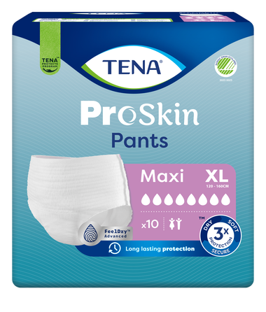 TENA ProSkin Pants Maxi XL (paredzētas lietotājam ar gurnu apkārtmēru no 120 līdz 160 cm) ir mīkstas un ērtas vīriešiem un sievietēm piemērotas biksītes urīna nesaturēšanas gadījumiem, lietojamas dienā un naktī. Atšķirībā no parastajām pieaugušo autiņbiksītēm TENA ProSkin Pants raksturo uzlabotas mitrumu samazinošas tehnoloģijas, kas nodrošina augstu uzsūktspēju, aizsardzību pret noplūdēm un smakām. Pilnīgai drošībai FeelDry Advanced™ ātri aizvada šķidrumu no virsmas, savukārt ātri uzsūcošā vidusdaļa uzreiz ieslēdz pat lielus urīna daudzumus, tādējādi mitrums nepaliek uz ādas un tas palīdz uzturēt ādu veselu. Šīs vienreizlietojamās biksītes ir izgatavotas no audumam līdzīgiem gaiscaurlaidīgiem materiāliem, kam ir izcila uzsūktspēja. Kā apakšveļa uzvelkamās biksītes veicina patstāvīgu un aktīvu ikdienas dzīvi. Pieejams plašs klāsts atšķirīgas uzsūktspējas un dažādu izmēru biksīšu TENA ProSkin Pants.