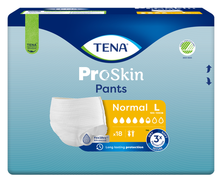 TENA ProSkin Pants Normal L (paredzētas lietotājam ar gurnu apkārtmēru no 100 līdz 135 cm) ir mīkstas un ērtas urīna nesaturēšanai paredzētas biksītes sievietēm un vīriešiem, valkāšanai gan dienā, gan naktī. Atšķirībā no parastajām pieaugušo autiņbiksēm TENA ProSkin biksīšu izgatavošanā ir izmantotas mitrumu uzsūcošās tehnoloģijas, kas nodrošina sausuma sajūtu, aizsardzību pret noplūdēm un nepatīkamo aromātu novēršanu. Pateicoties FeelDry Advanced™ slānim, šķidrums no virsējās kārtas ātri uzsūcas, un īpaši absorbējošais iekšējais slānis uzreiz notur pat lielu urīna daudzumu, neļaujot ādai nonākt saskarē ar mitrumu un saudzējot ādu. Šīs vienreiz lietojamās biksītes ir izgatavotas no audumam līdzīgiem elpojošiem materiāliem ar izcilu uzsūktspēju, tās ir uzvelkamas tāpat kā parastā apakšveļa, tāpēc šis izstrādājums veicina neatkarīgu un aktīvu ikdienas dzīvi. TENA ProSkin biksītēm ir dažādas uzsūktspējas pakāpes un plašs izmēru klāsts.