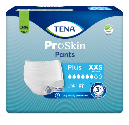 TENA ProSkin Pants Plus XXS (paredzētas lietotājam ar gurnu apkārtmēru no 40 līdz 70 cm) ir mīkstas un ērtas vīriešiem un sievietēm piemērotas biksītes urīna nesaturēšanas gadījumiem, lietojamas dienā un naktī. Atšķirībā no parastajām pieaugušo autiņbiksītēm TENA ProSkin Pants raksturo uzlabotas mitrumu samazinošas tehnoloģijas, kas nodrošina augstu uzsūktspēju, aizsardzību pret noplūdēm un smakām. Pilnīgai drošībai FeelDry Advanced™ ātri aizvada šķidrumu no virsmas, savukārt ātri uzsūcošā vidusdaļa uzreiz ieslēdz pat lielus urīna daudzumus, tādējādi mitrums nepaliek uz ādas un tas palīdz uzturēt ādu veselu. Šīs vienreizlietojamās biksītes ir izgatavotas no audumam līdzīgiem gaiscaurlaidīgiem materiāliem, kam ir izcila uzsūktspēja. Kā apakšveļa uzvelkamās biksītes veicina patstāvīgu un aktīvu ikdienas dzīvi. Pieejams plašs klāsts atšķirīgas uzsūktspējas un dažādu izmēru biksīšu TENA ProSkin Pants.