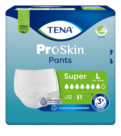 TENA ProSkin Pants Super L (paredzētas lietotājam ar gurnu apkārtmēru no 80 līdz 110 cm) ir mīkstas un ērtas vīriešiem un sievietēm piemērotas biksītes ūrīna nesaturēšanas gadījumiem, lietojamas dienā un naktī. Atšķirībā no parastajām pieaugušo biksītēm TENA ProSkin Pants raksturo uzlabotas mitrumu samazinošas tehnoloģijas, kas nodrošina augstu uzsūktspēju, aizsardzību pret noplūdēm un smakām. Pilnīgai drošībai FeelDry Advanced™ ātri aizvada šķidrumu no virsmas, savukārt ātri uzsūcošā vidusdaļa uzreiz ieslēdz pat lielus urīna daudzumus, tādējādi mitrums nepaliek uz ādas un tas palīdz uzturēt ādu veselu. Šīs vienreizlietojamās biksītes ir izgatavotas no audumam līdzīgiem gaiscaurlaidīgiem materiāliem, kam ir izcila uzsūktspēja. Kā apakšveļa uzvelkamās biksītes veicina patstāvīgu un aktīvu ikdienas dzīvi. Pieejams plašs klāsts atšķirīgas uzsūktspējas un dažādu izmēru biksīšu TENA ProSkin Pants.