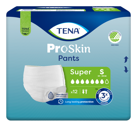 TENA ProSkin Pants Super S (paredzētas lietotājam ar gurnu apkārtmēru no 65 līdz 85 cm) ir mīkstas un ērtas vīriešiem un sievietēm piemērotas biksītes uzrīna nesaturēšanas gadījumiem, lietojamas dienā un naktī. Atšķirībā no parastajām pieaugušo biksītēm TENA ProSkin Pants raksturo uzlabotas mitrumu samazinošas tehnoloģijas, kas nodrošina augstu uzsūktspēju, aizsardzību pret noplūdēm un smakām. Pilnīgai drošībai FeelDry Advanced™ ātri aizvada šķidrumu no virsmas, savukārt ātri uzsūcošā vidusdaļa uzreiz ieslēdz pat lielus urīna daudzumus, tādējādi mitrums nepaliek uz ādas un tas palīdz uzturēt ādu veselu. Šīs vienreizlietojamās biksītes ir izgatavotas no audumam līdzīgiem gaiscaurlaidīgiem materiāliem, kam ir izcila uzsūktspēja. Kā apakšveļa uzvelkamās biksītes veicina patstāvīgu un aktīvu ikdienas dzīvi. Pieejams plašs klāsts atšķirīgas uzsūktspējas un dažādu izmēru biksīšu TENA ProSkin Pants.