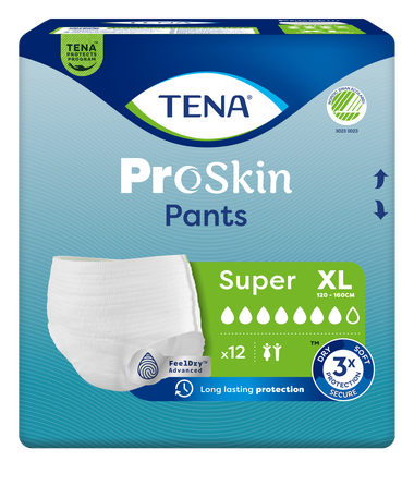 TENA ProSkin Pants Super XL (paredzētas lietotājam ar gurnu apkārtmēru no 120 līdz 160 cm) ir mīkstas un ērtas vīriešiem un sievietēm piemērotas biksītes uzrīna nesaturēšanas gadījumiem, lietojamas dienā un naktī. Atšķirībā no parastajām pieaugušo biksītēm TENA ProSkin Pants raksturo uzlabotas mitrumu samazinošas tehnoloģijas, kas nodrošina augstu uzsūktspēju, aizsardzību pret noplūdēm un smakām. Pilnīgai drošībai FeelDry Advanced™ ātri aizvada šķidrumu no virsmas, savukārt ātri uzsūcošā vidusdaļa uzreiz ieslēdz pat lielus urīna daudzumus, tādējādi mitrums nepaliek uz ādas un tas palīdz uzturēt ādu veselu. Šīs vienreizlietojamās biksītes ir izgatavotas no audumam līdzīgiem gaiscaurlaidīgiem materiāliem, kam ir izcila uzsūktspēja. Kā apakšveļa uzvelkamās biksītes veicina patstāvīgu un aktīvu ikdienas dzīvi. Pieejams plašs klāsts atšķirīgas uzsūktspējas un dažādu izmēru biksīšu TENA ProSkin Pants.