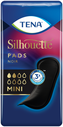 TENA Silhouette Noir Mini ir speciāli paredzētas melnai apakšveļai. Neatkarīgi no tā vai ģērbjaties sporta zālē, vai mājās, savā guļamistabā, ar TENA Silhouette jūs varat justies droši. Tā ir plāna un tā melnā krāsa lieliski sader ar melno apakšveļu. TENA Silhouette Noir Mini ir trīskārša aizsardzība pret noplūdēm, nepatīkamo urīna smaku un mitrumu - nelielas urīna noplūdes tiek efektīvi uzsūktas izstrādājuma dziļākajos slāņos.