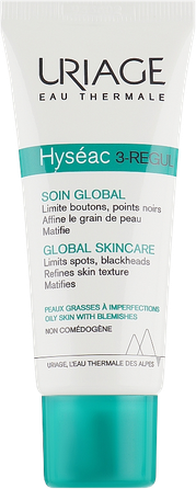 Uriage Hyseac 3-Regul Global viegls krēms. Taukainai ādai, ierobežo pūtīšu un komedonu rašanos, regulē tauku izdalīšanos, sniedz matētu efektu. Satur 3 patentētus kompleksus: TLR2-Regul (pretiekaisuma iedarbība), AHA (iedarbojas keratolītiski), MPA-Regul (iedarbojas antibakteriāli), tāpat arī Uriage termālo ūdeni, kas nomierina un mitrina ādu, stiprina ādas aizsargspējas. Lakricas saknes ekstrakts savelk poras un regulē sebuma izdalīšanos.