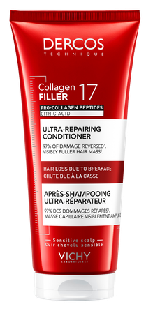 JAUNUMS: pirmais īpaši atjaunojošais DERCOS matu un galvas ādas kopšanas līdzeklis. Bagātināts ar citronskābi un prokolagēna peptīdiem, kas stiprina matu šķiedras (4) un nepieļauj matu izkrišanu trausluma dēļ. KONDICIONIERIS papildus padara matus mīkstus un spīdīgus, gludus un viegli ķemmējamus. PIERĀDĪTA EFEKTIVITĀTE: PAR 97% STIPRĀKI MATI (1) PAR 29% LIELĀKS APJOMS (2) Piemērots visu veidu matiem. Dermatoloģiski testēts. (1) Matu bojājumi to trausluma dēļ. Instrumentāls tests pēc līdzekļa pirms šampūna lietošanas, šampūna un kondicioniera lietošanas. (2) Instrumentāls tests pēc līdzekļa pirms šampūna lietošanas, šampūna un kondicioniera lietošanas. (4) Sastāvdaļu in vitro tests.