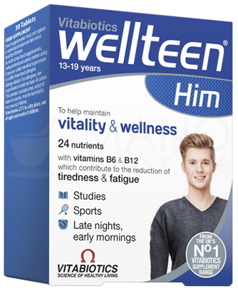 24 uzturvielas, lai palīdzētu uzturēt vitalitāti un labu veselību. Veselīga, sabalansēta uztura nodrošināšana ir svarīga, bet tā ne vienmēr ir prioritāte steidzīgajā pusaudža dzīvē. Wellteen® Him ir īpaši izstrādāta formula, lai sniegtu visaptverošu vitamīnu, minerālvielu un dabas ekstraktu kompleksu un palīdzētu nodrošināt ikdienas uzturvielu prasības pusaudžiem un jauniem vīriešiem vecumā no 13-19 gadiem. Wellteen® Him nodrošina ar vitamīniem B6, B12, un C, kas veicina normālu enerģijas ieguves vielmaiņu, un samazina nogurumu un nespēku, tā palīdzot saglabāt vitalitāti un vispārējo labsajūtu. Imūnsistēma: D vitamīns, cinks un selēns veicina normālu imūnsistēmas darbību. Kognitīvās spējas: cinks, dzelzs un jods veicina normālas kognitīvās funkcijas, bet pantotēnskābe palīdz uzturēt garīgās darbaspējas.