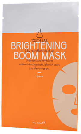 Brightening Boom Mask ir ar serumu piesātināta lokšņu maska, kas atjauno ādas mirdzumu un vienmērīgu toni, vienlaikus samazinot plankumus, pigmentācijas izmaiņas un aknes pēdas.